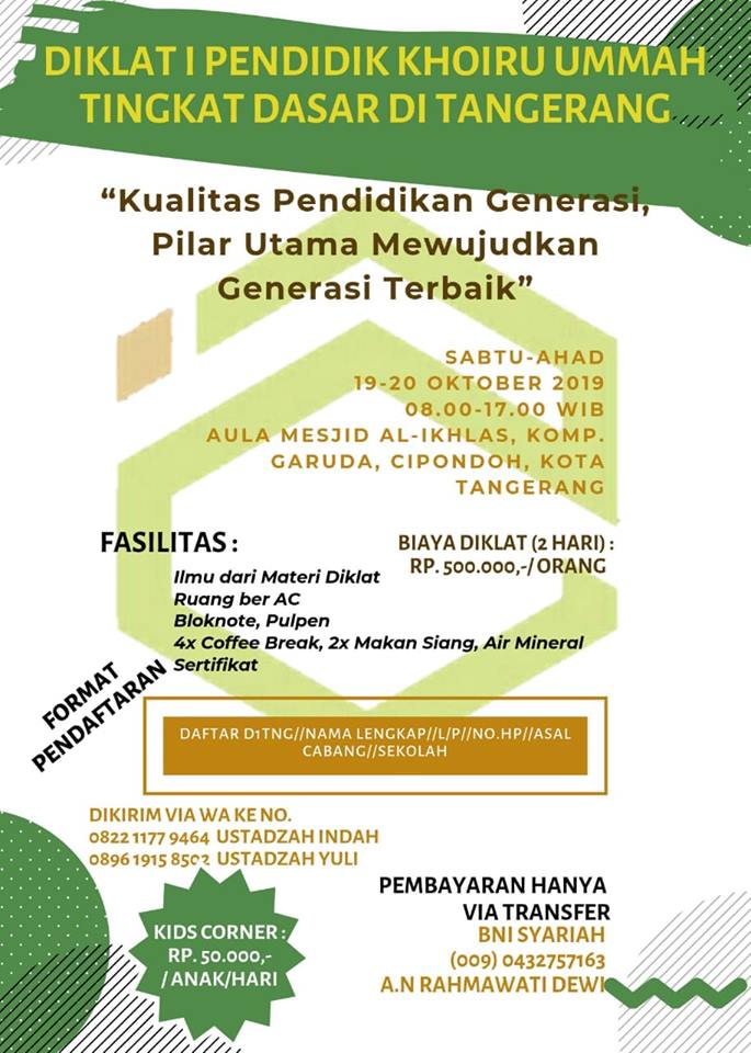 “Kualitas Pendidikan Generasi, Pilar Utama Mewujudkan Generasi Terbaik” (Diklat untuk guru dan orang tua) 🗓 Sabtu-Ahad, 19-20 Oktober 2019 Mulai pukul 08.00 s/d 17.00 WIB —————————————— 👤 Pemateri: Usth. Ariani Mufida S. P (Praktisi pendidikan dan Kepala STP KU setara Dasar Bubulak, Bogor) 🏡 Tempat : Aula Masjid Al Ikhlas, komplek Garuda, Cipondoh, Kota Tangerang. …